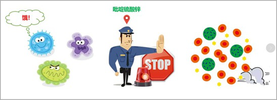 微生物通過離子運輸營養(yǎng)維持生長繁殖,吡啶硫酮通過破壞微生物的該運輸方式,讓營養(yǎng)運輸不進(jìn)去,使得細(xì)菌最終被餓死。同時,鋅離子本身也具有一定的抑菌能力。因此,吡啶硫酮鋅在殺菌的同時,本身并未被消耗,可反復(fù)殺菌,具有高效、長效的殺菌能力。